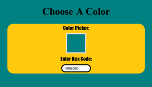 <!DOCTYPE html> <html> <head> <title>Choose A Color</title> <style> body { margin: 2; padding: 2; display: grid; place-items: center; height: 50vh; font-size: 20px; } .main { height: 200px; width: 550px; background: #FFC90e; border-radius: 5px; display: grid; place-items: center; color: #00000; font-family: Impact; border-radius: 25px; } #colorPicker { background-color: none; outline: none; border: none; height: 80px; width: 80px; cursor: pointer; } #box { outline: none; border: 4px solid #000; border-radius: 30px; height: 25px; width: 90px; padding: 0 10px; } </style> </head> <body> <h1>Choose A Color</h1> <div class="main"> Color Picker: <input type="color" id="colorPicker" value="#35cdde"> Enter Hex Code: <input type="text" id="box"> </div> <script> function myColor() { var color = document.getElementById('colorPicker').value; document.body.style.backgroundColor = color; document.getElementById('box').value = color; } document.getElementById('colorPicker') .addEventListener('input', myColor); </script> </body> </html>